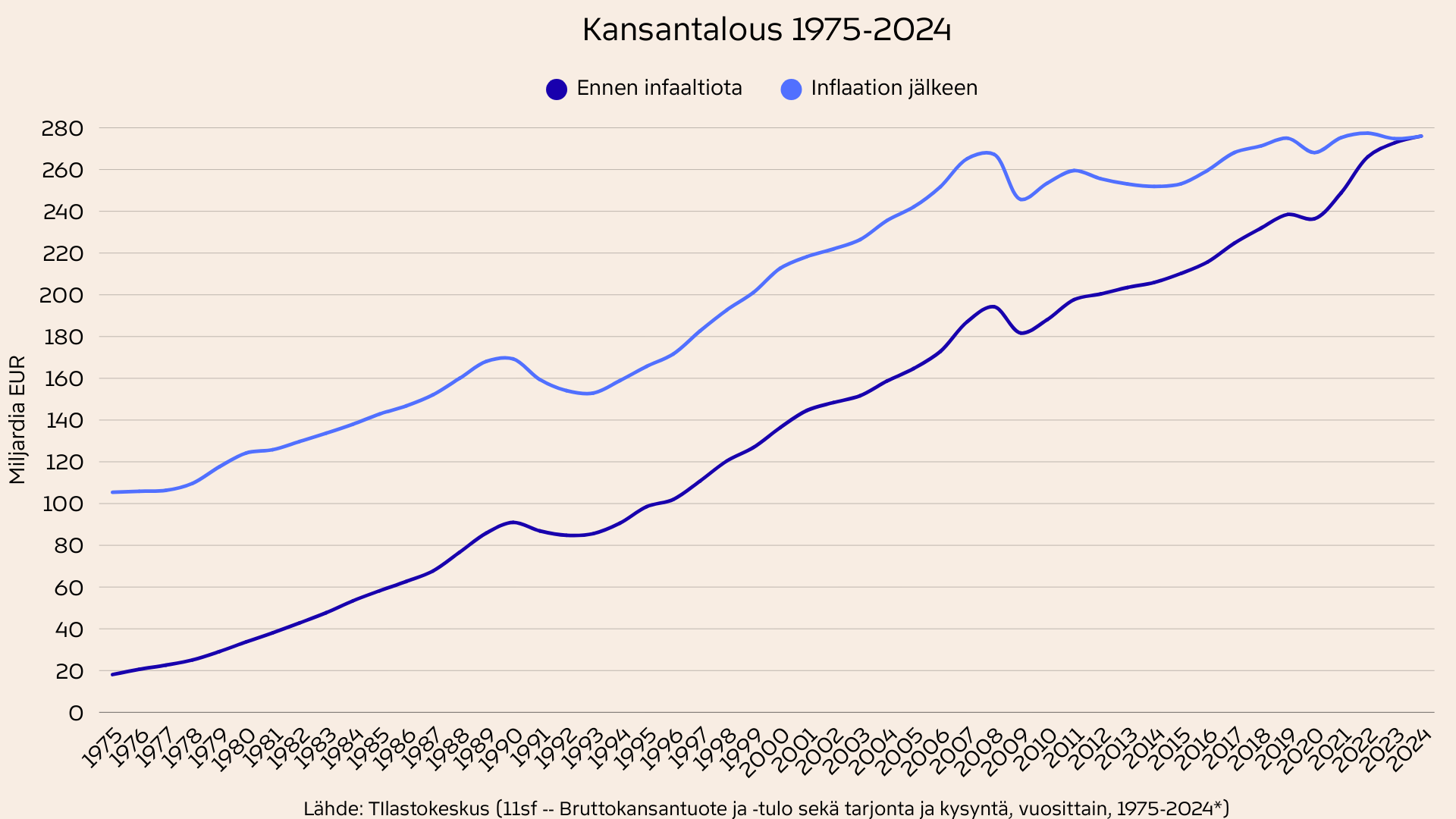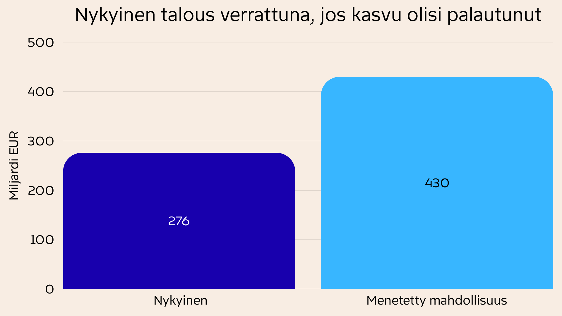 Jos talouden kasvu olisi palautunut ennalleen finanssikriisin jälkeen, niin olisi Suomen kansantalous nykyään noin 430 miljardia euroa, verrattuna saavutettuun 276 miljardiin euroon.