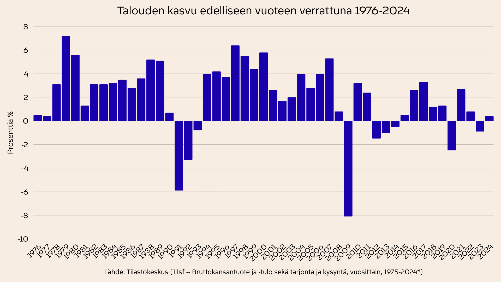 Kuva 2. Talouden kasvu edelliseen vuoteen verrattuna 1976-2024