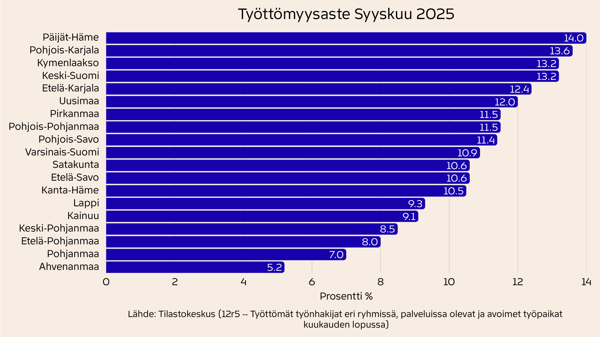 Kuva 5. Työttömyysaste maakunnittain syyskuu 2025